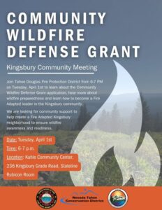 Come and meet Tahoe Douglas Fire, Tahoe Resource Conservation District, and Nevada Tahoe Resource Conservation District. Learn more about how to become a Fire Adapted/Firewise community leader for the Kingsbury area.