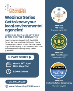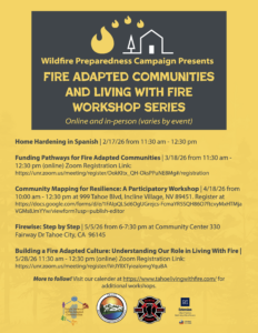 Join Tahoe Living with Fire and UNR’s Living with Fire programs for a series of in-person and virtual workshops and webinars related to wildfire preparedness. For the full list of events, see the flyer below.
