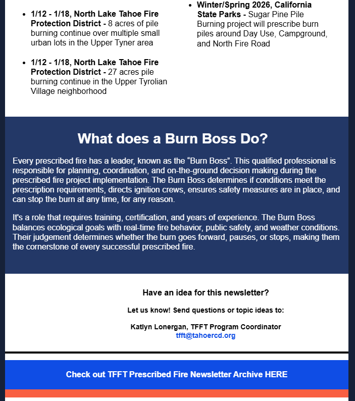 Learn about upcoming prescribed fire projects from the Tahoe Fire & Fuels Team Prescribed Fire Newsletter: