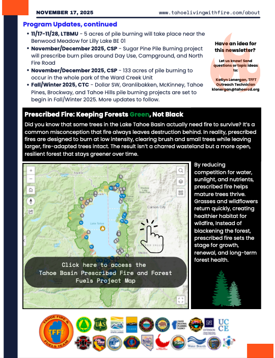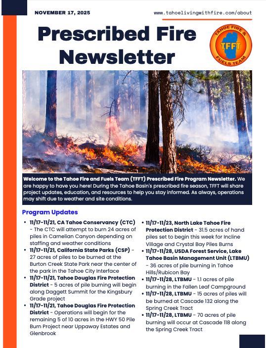Learn about prescribed fire and fuels reduction projects happing in the Basin from the Tahoe Fire & Fuels Prescribed Fire Newsletter: